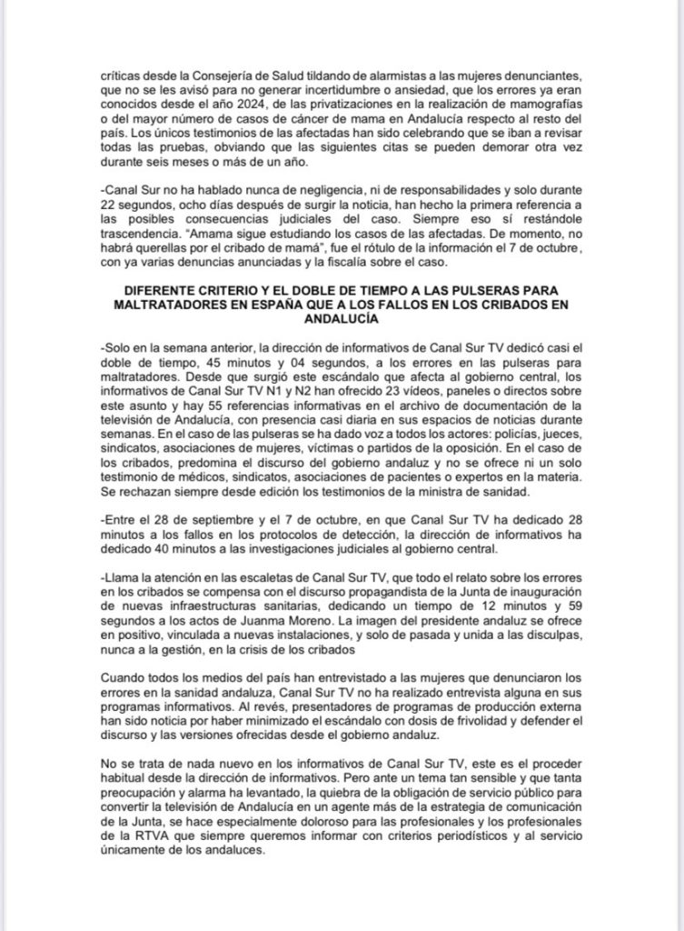 El documento también acusa a la dirección de informativos de haber mantenido un criterio doble en la cobertura de otros asuntos. Señala que Canal Sur dedicó 45 minutos y 4 segundos a los errores en las pulseras para maltratadores -un tema que afecta al Gobierno central-, frente a los 28 minutos concedidos al caso de los cribados, incluyendo 23 vídeos, paneles y directos sobre el primer asunto y más de medio centenar de referencias en el archivo de documentación. En ese tratamiento, añade el documento, se dio voz a jueces, policías, sindicatos, asociaciones de mujeres, víctimas y partidos de la oposición, mientras que en el caso de los cribados predominó exclusivamente el discurso del Gobierno andaluz.