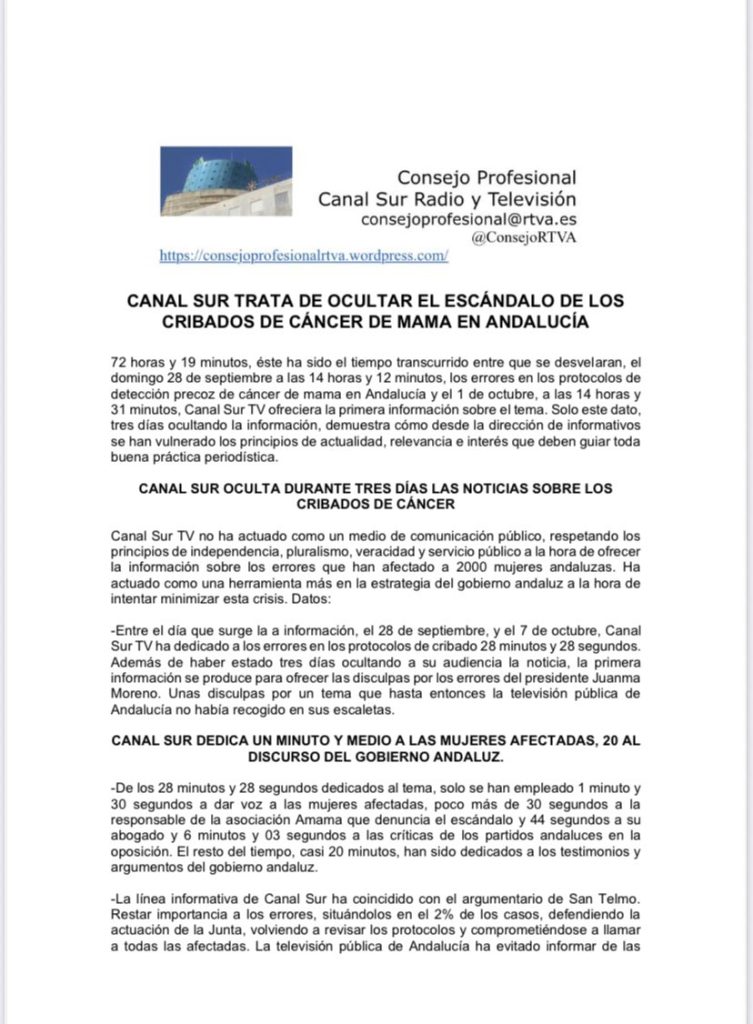 El Consejo Profesional de Canal Sur Radio y Televisión ha acusado a la dirección de informativos del ente público de ocultar durante tres días el escándalo derivado de los errores en los protocolos de detección precoz del cáncer de mama en Andalucía