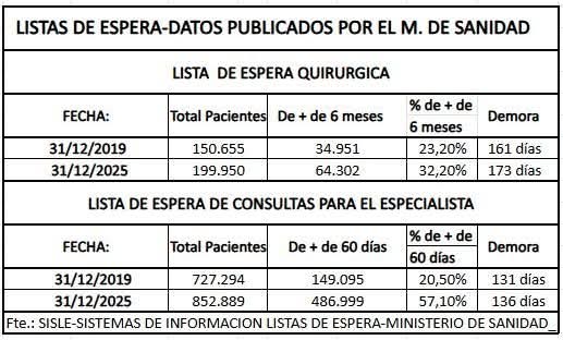 Si se bucea en las cifras de la lista de espera quirúrgica, se llega a un dato demoledor: en diciembre de 2019 había 34.951 enfermos con una demora de más de más de seis meses (un 23,2% del total)… pero, en diciembre de 2025, esa cantidad de personas necesitadas de quirófano se ha duplicado hasta llegar a un número preocupante de 64.302 personas (un 32,2% del total).