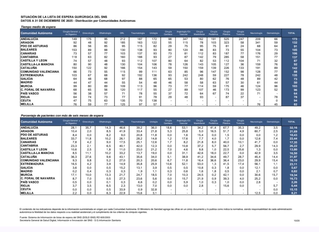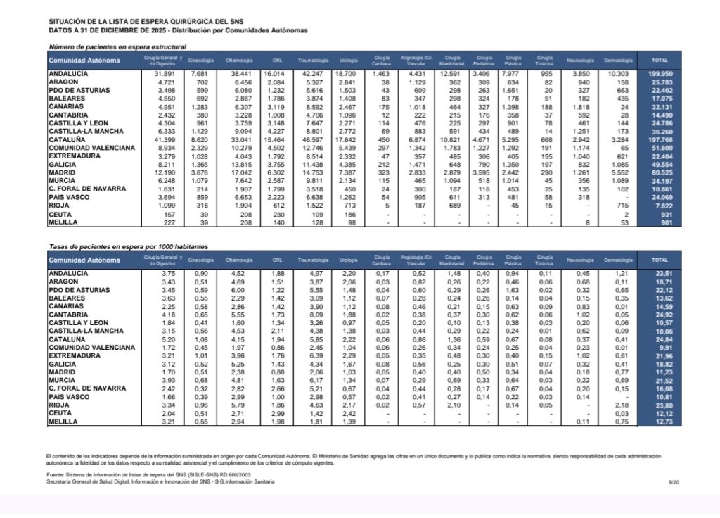 El Ministerio de Sanidad ha publicado su informe semestral sobre listas de espera quirúrgicas y consultas externas en todas las comunidades autónomas, la actualización correspondiente a diciembre de 2025. La radiografía general deja pocos cambios respecto al ejercicio anterior: en Andalucía. La lista quirúrgica incluso ha crecido ligeramente y cerró 2025 con 199.950 pacientes pendientes de una intervención, es decir, 5.791 más que al cierre de 2024.