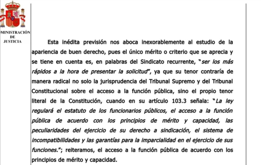 arriba indicada”. Esta inédita previsión, según el auto, «nos aboca inexorablemente al estudio de la apariencia de buen derecho, pues el único mérito o criterio que se aprecia y se tiene en cuenta es, en palabras del sindicato recurrente, “ser los más rápidos a la hora de presentar la solicitud”, ya que su tenor contraría de manera radical no solo la jurisprudencia del Tribunal Supremo y del Tribunal Constitucional sobre el acceso a la función pública, sino el propio tenor literal de la Constitución, cuando en su artículo 103.3 señala: “La ley regulará el estatuto de los funcionarios públicos, el acceso a la función pública de acuerdo con los principios de mérito y capacidad, las peculiaridades del ejercicio de su derecho a sindicación, el sistema de incompatibilidades y las garantías para la imparcialidad en el ejercicio de sus funciones.”; reiteramos, el acceso a la función pública de acuerdo con los principios de mérito y capacidad».