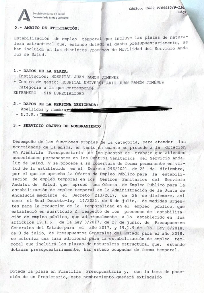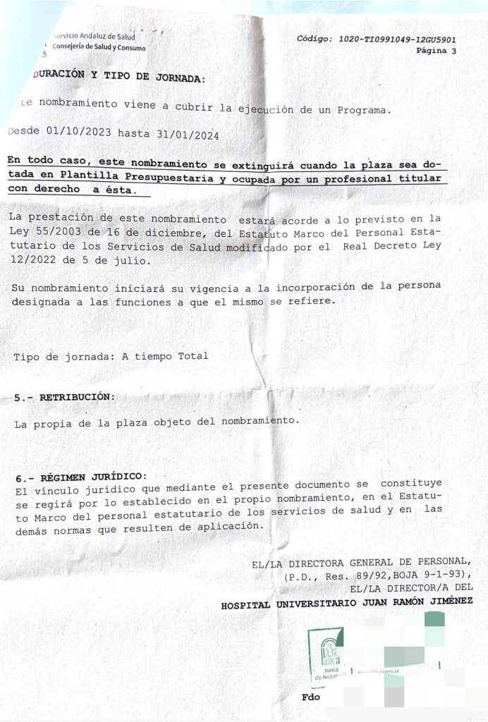 Pocos días antes de acabar este plazo, estos profesionales sanitarios recibieron una nueva llamada, esta vez por parte del área de Personal del Hospital Juan Ramón Jiménez, en la cual se les pide que acudan a firmar una nueva prórroga, de otros cuatro meses, hasta nuevo aviso. «Firmamos entonces un nuevo contrato con fecha de inicio de 1 de febrero de 2024 y fecha de fin de 31 de mayo de 2024. Durante este plazo, nos dicen, firmaremos nuestro contrato interino», pone de relieve la enfermera.