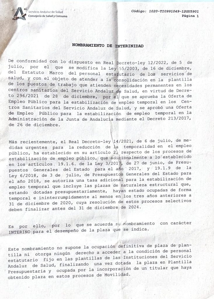 Una vez expuestos todos estos puntos y el evidente perjuicio que está suponiendo para los profesionales afectados por dichos contratos, esta profesional sanitaria, que habla en nombre también de otros compañeros, solicita que «se ponga fin a esta situación con la firma definitiva de estos contratos interinos«.