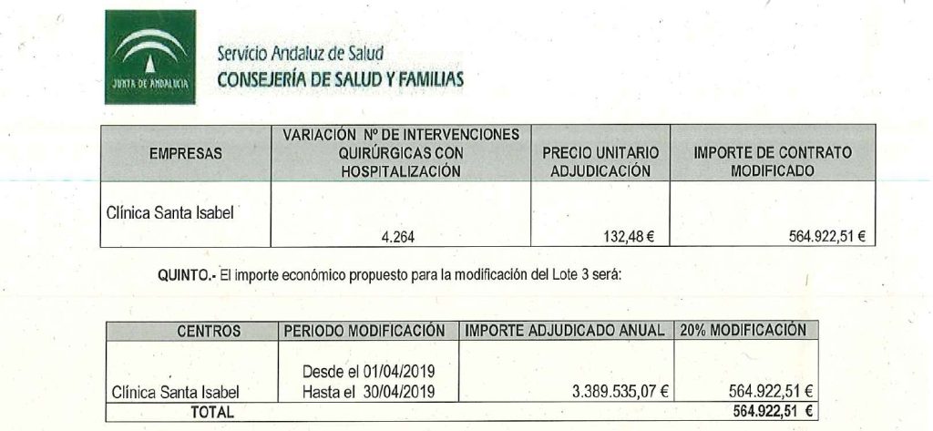 El contrato formalizado con la empresa Clínica Santa Isabel fue modificado posteriormente, figurando en el expediente una cláusula adicional que no tiene fecha. Además, sin estar debidamente justificado con los datos necesarios (se emplearon justificaciones genéricas, una vez más), y debido a supuestas intervenciones quirúrgicas a realizar entre el 1 de abril y el 30 de abril de 2019, se acordó incrementar el importe del contrato con dicha empresa en 564.922,51 euros.